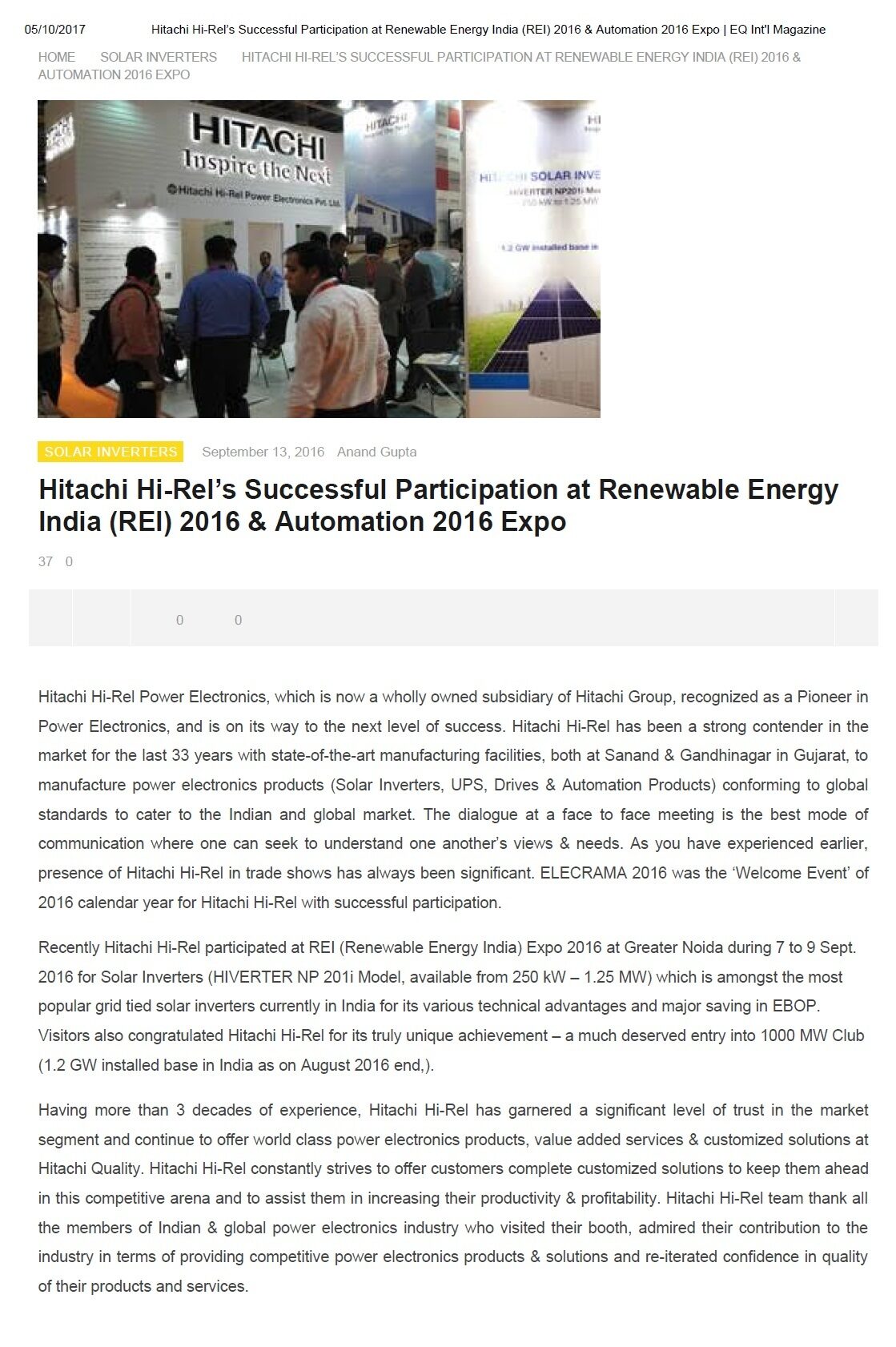 Hitachi Hi-Rel's Successful Participation at Renewable Energy India (REI) 2016 & Automation 2016 Expo
