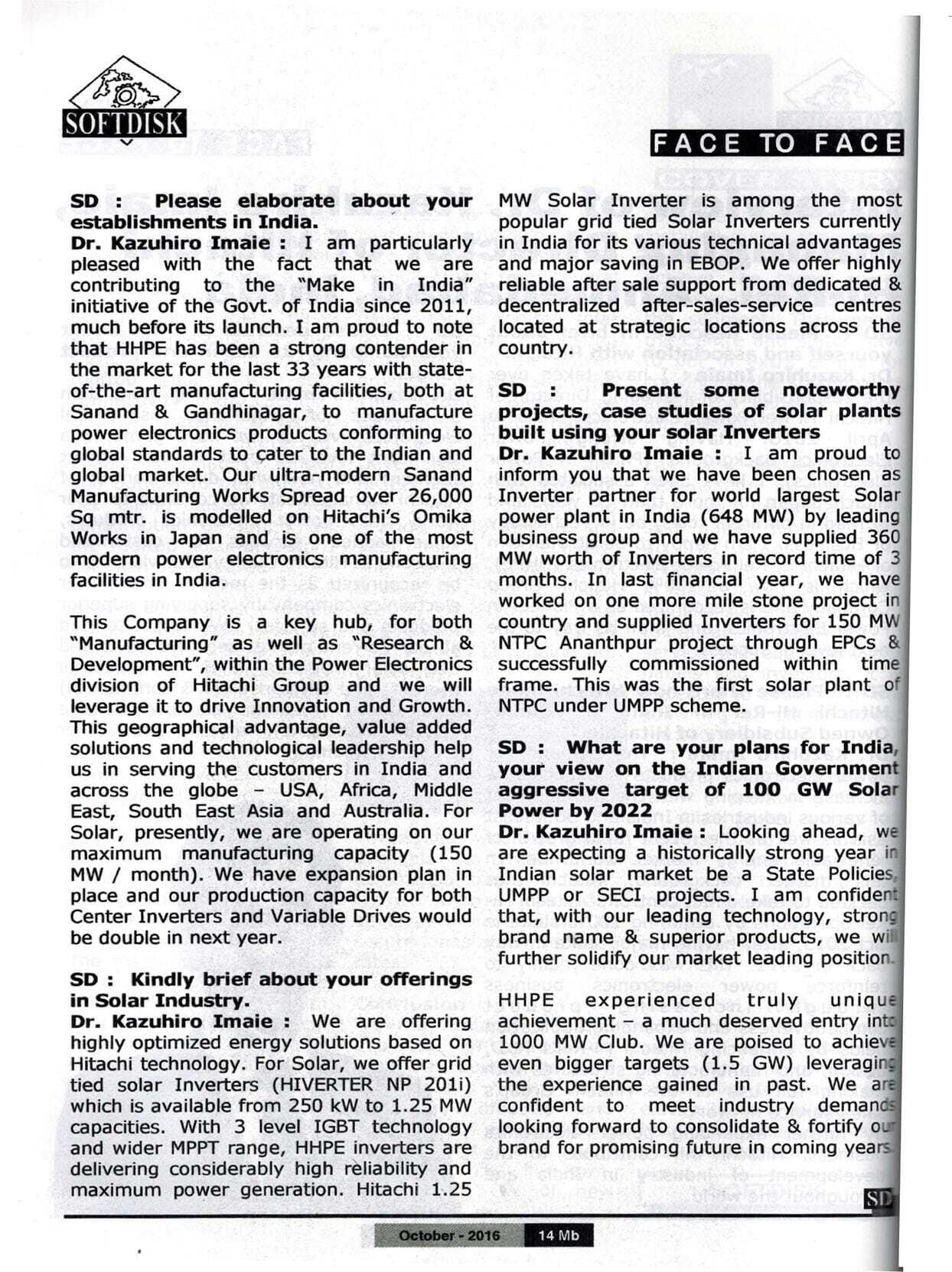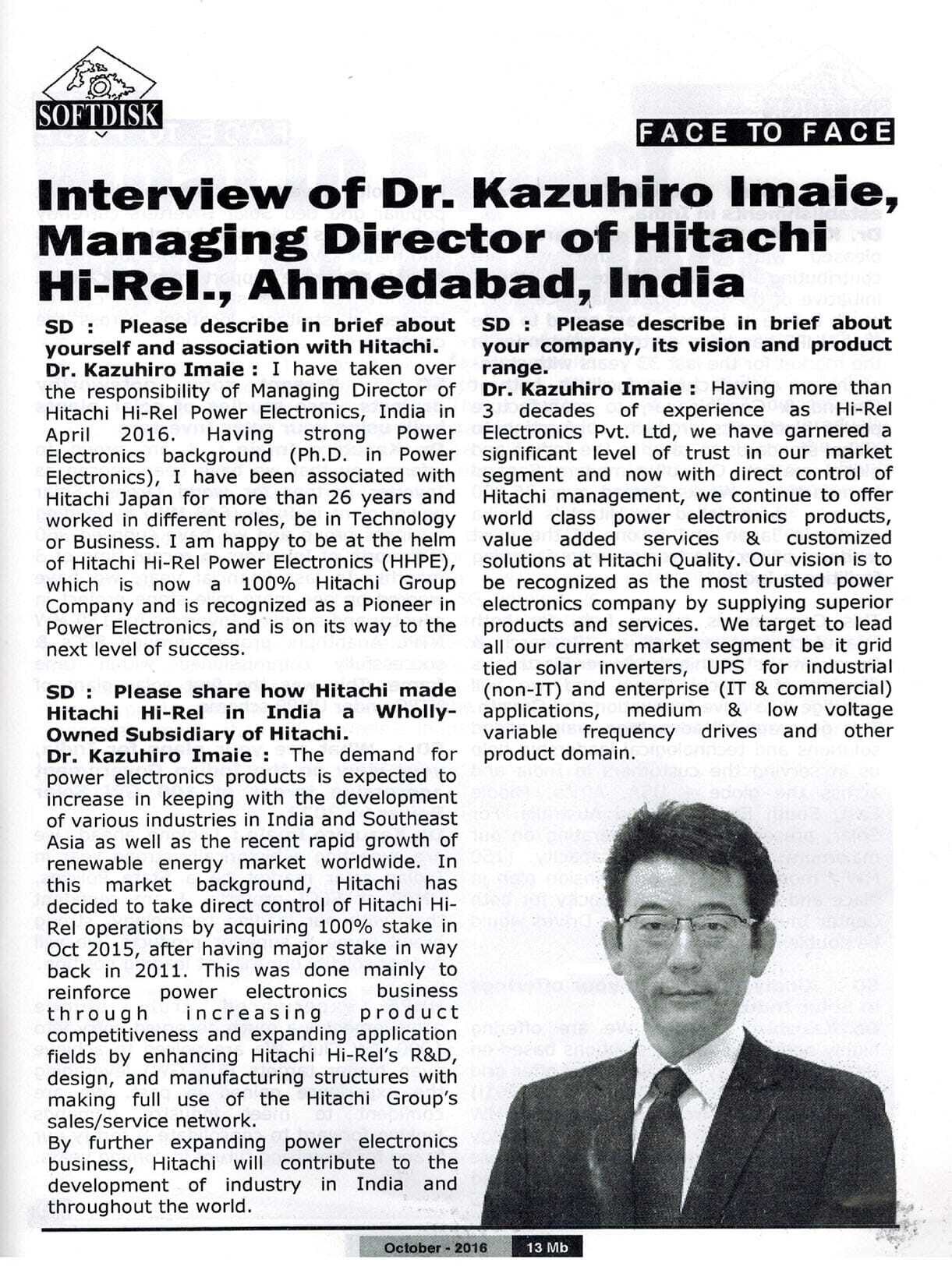Interview of Dr. Kazuhiro Imaie (Managing Director) in Indian Electrical C&T September 2016 Issue