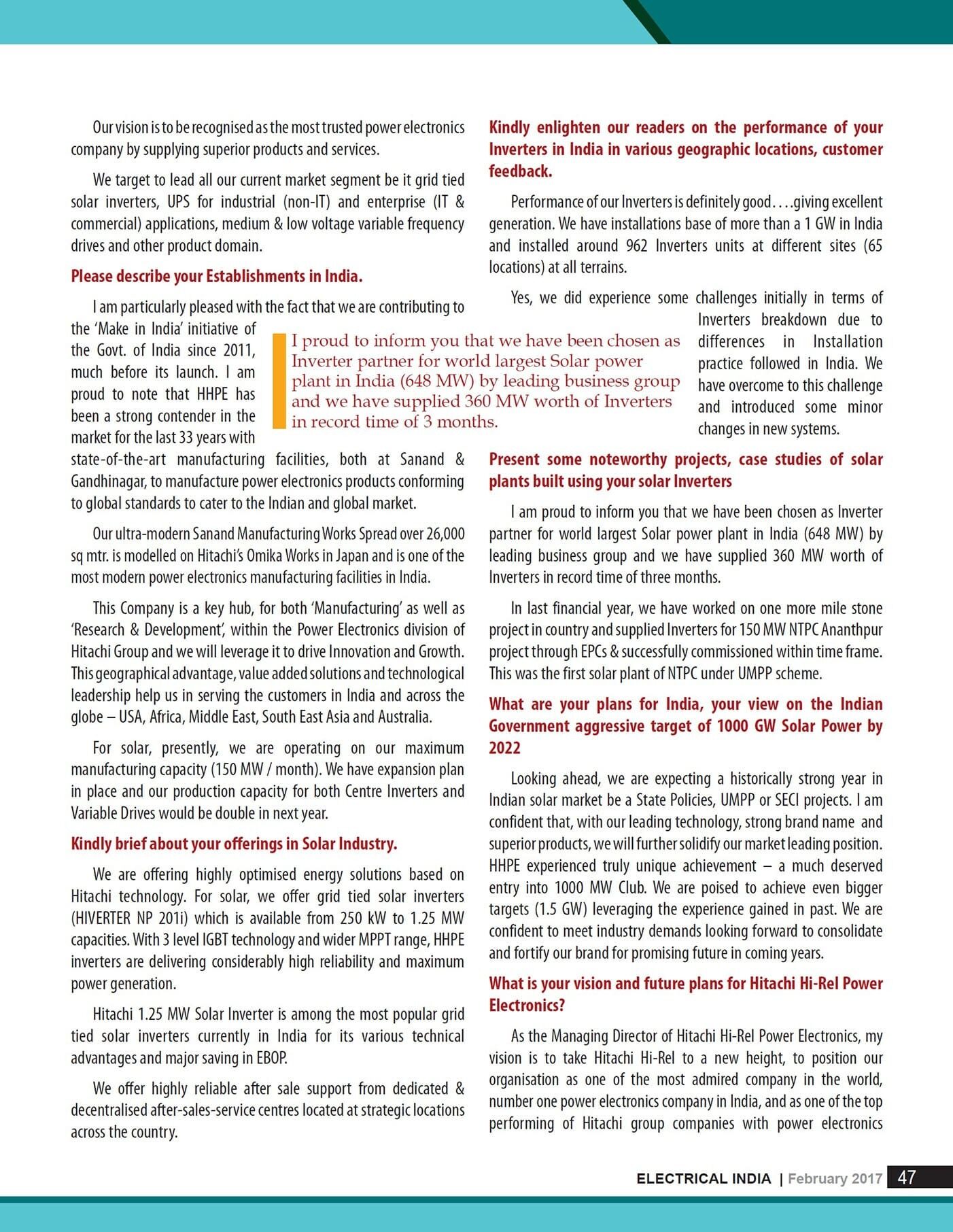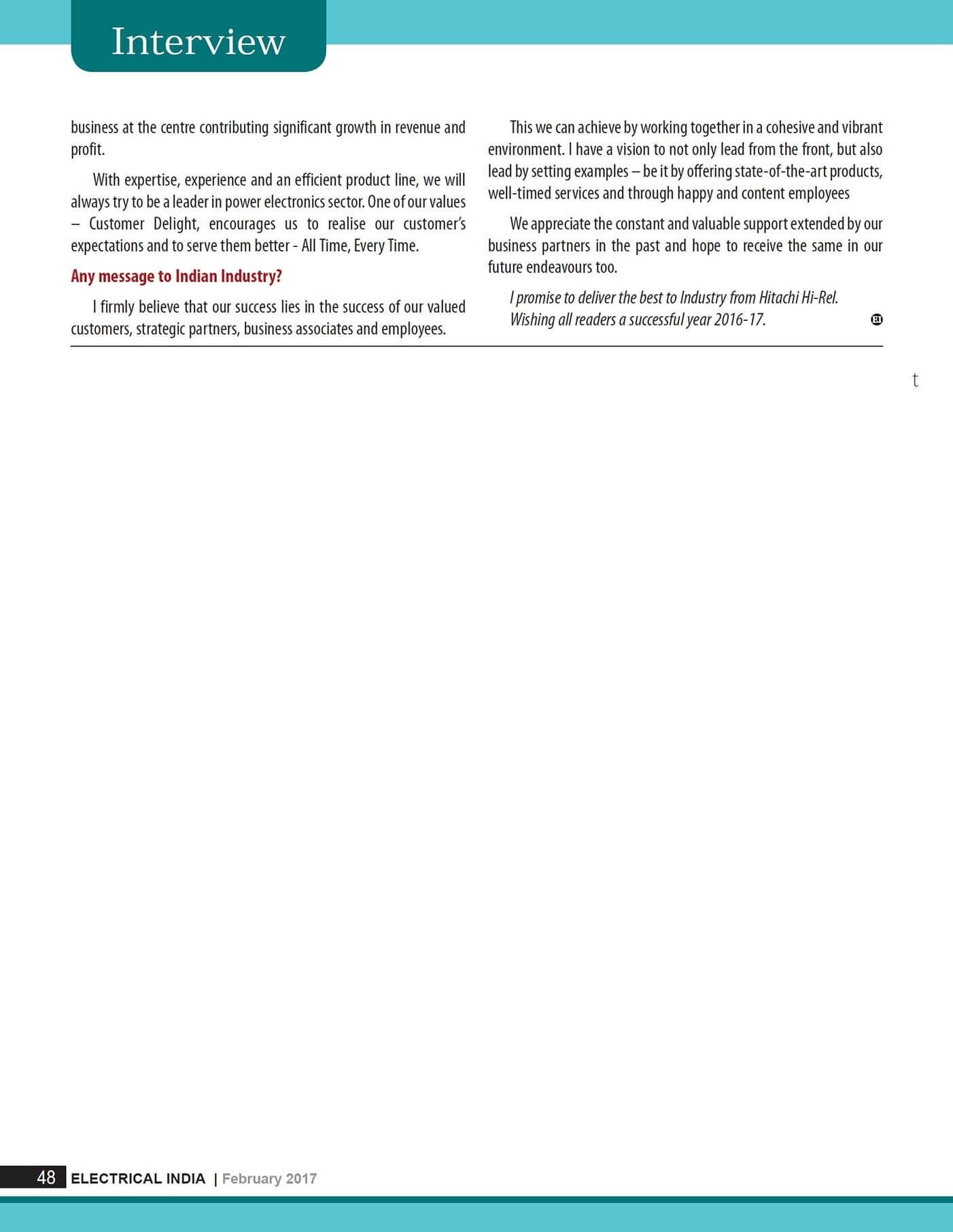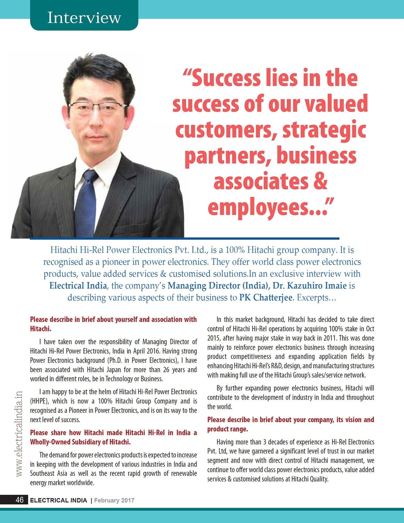 Interview of Dr. Kazuhiro Imaie (Managing Director) in Electrical India February 2017 Issue