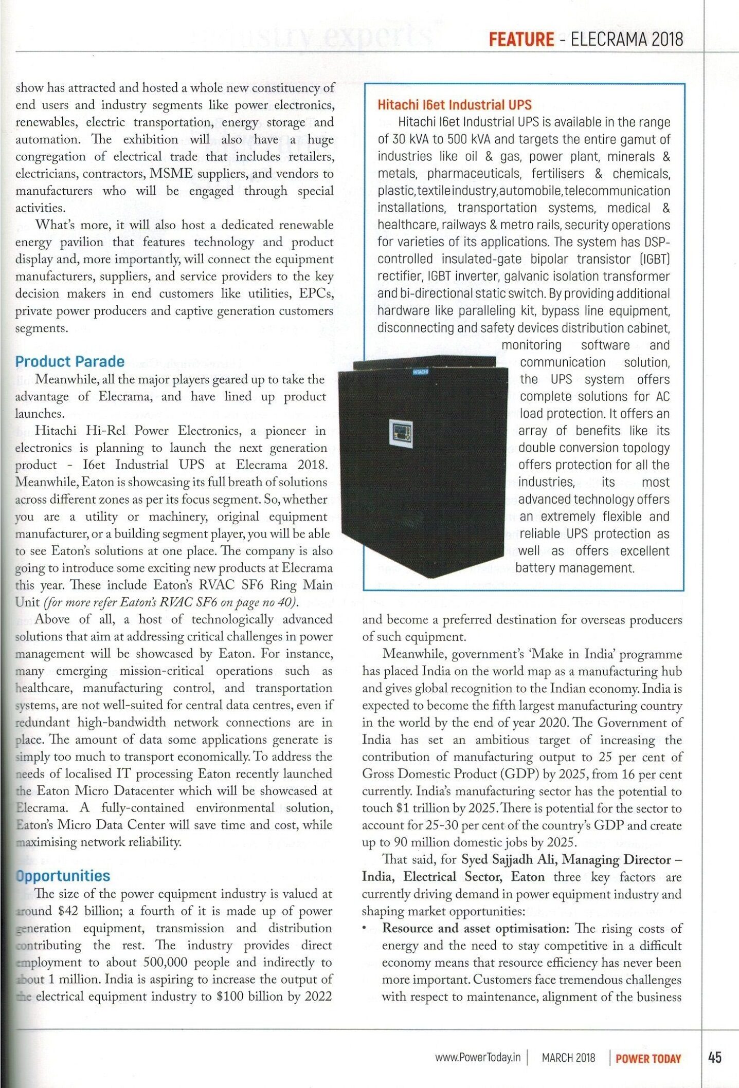I6et Industrial UPS Product Coverage in Power Today Magazine, March 2018 Issue