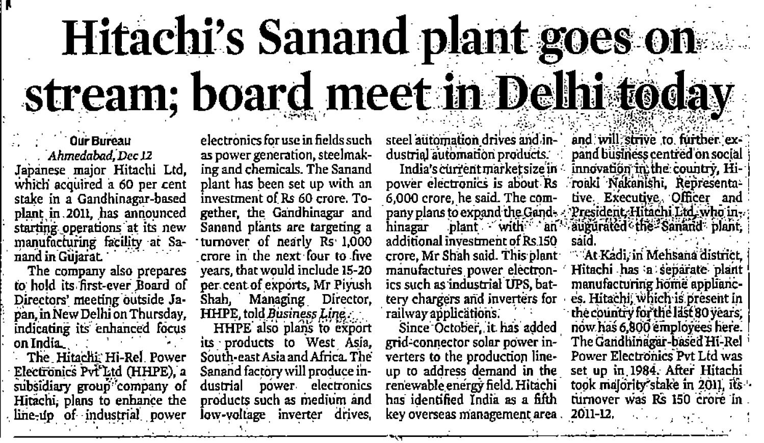 Sanand Plant Inauguration Coverage in Hindu Business Line December 2012