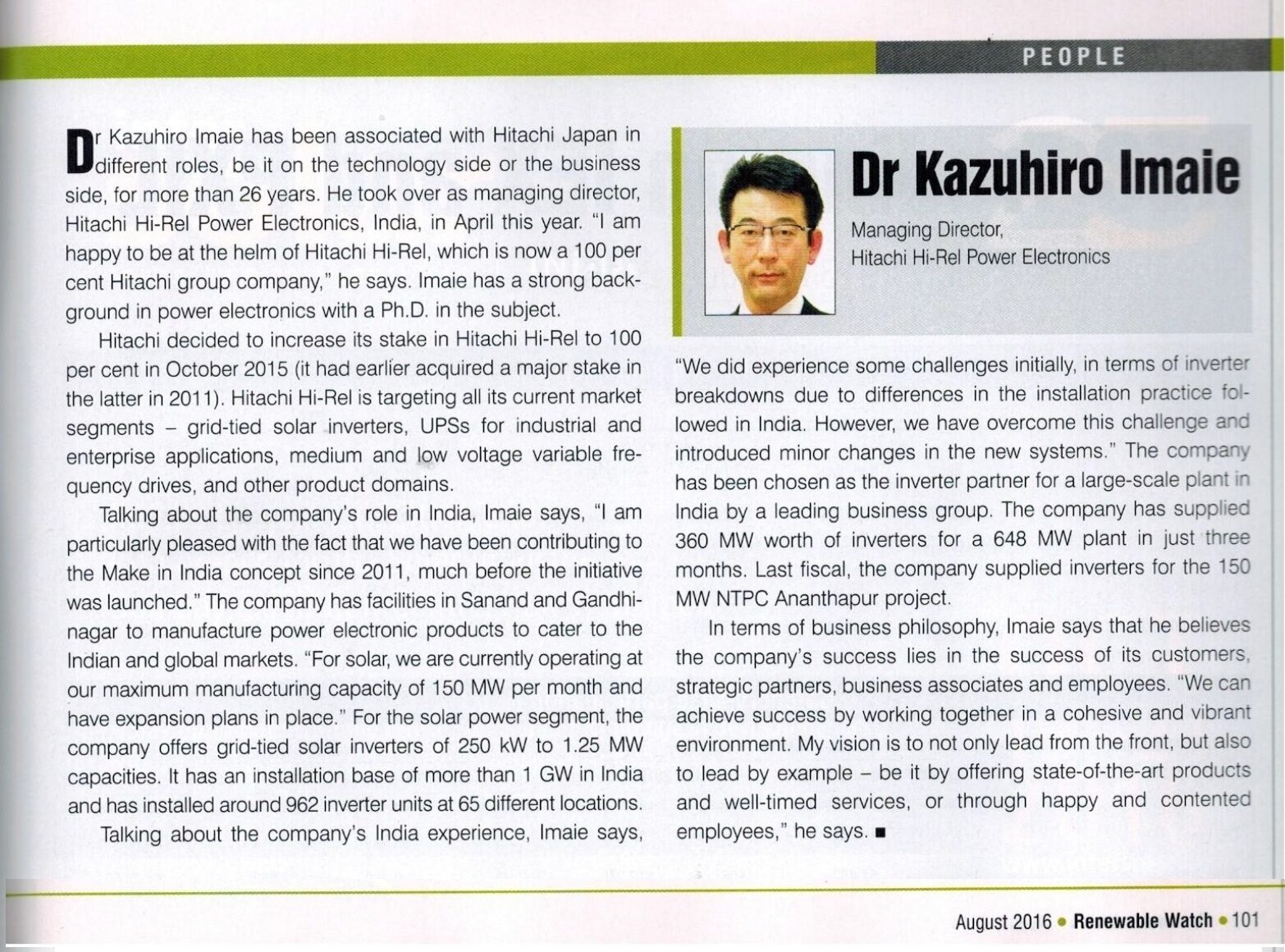 Interview of Dr. Kazuhiro Imaie (Managing Director) in Renewable Watch August 2016 Issue