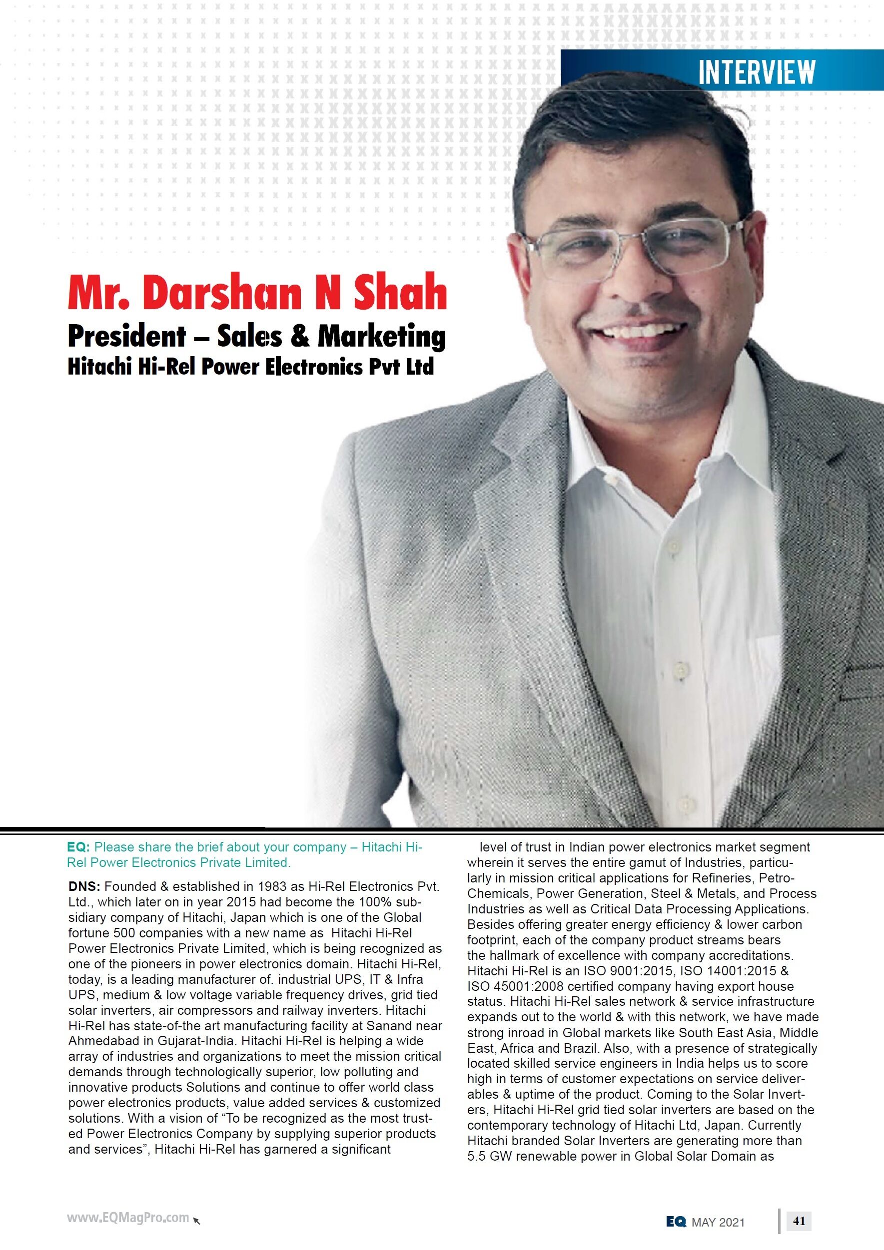 Interview Coverage of Mr. Darshan A Shah in IEEMA Journal Magazine