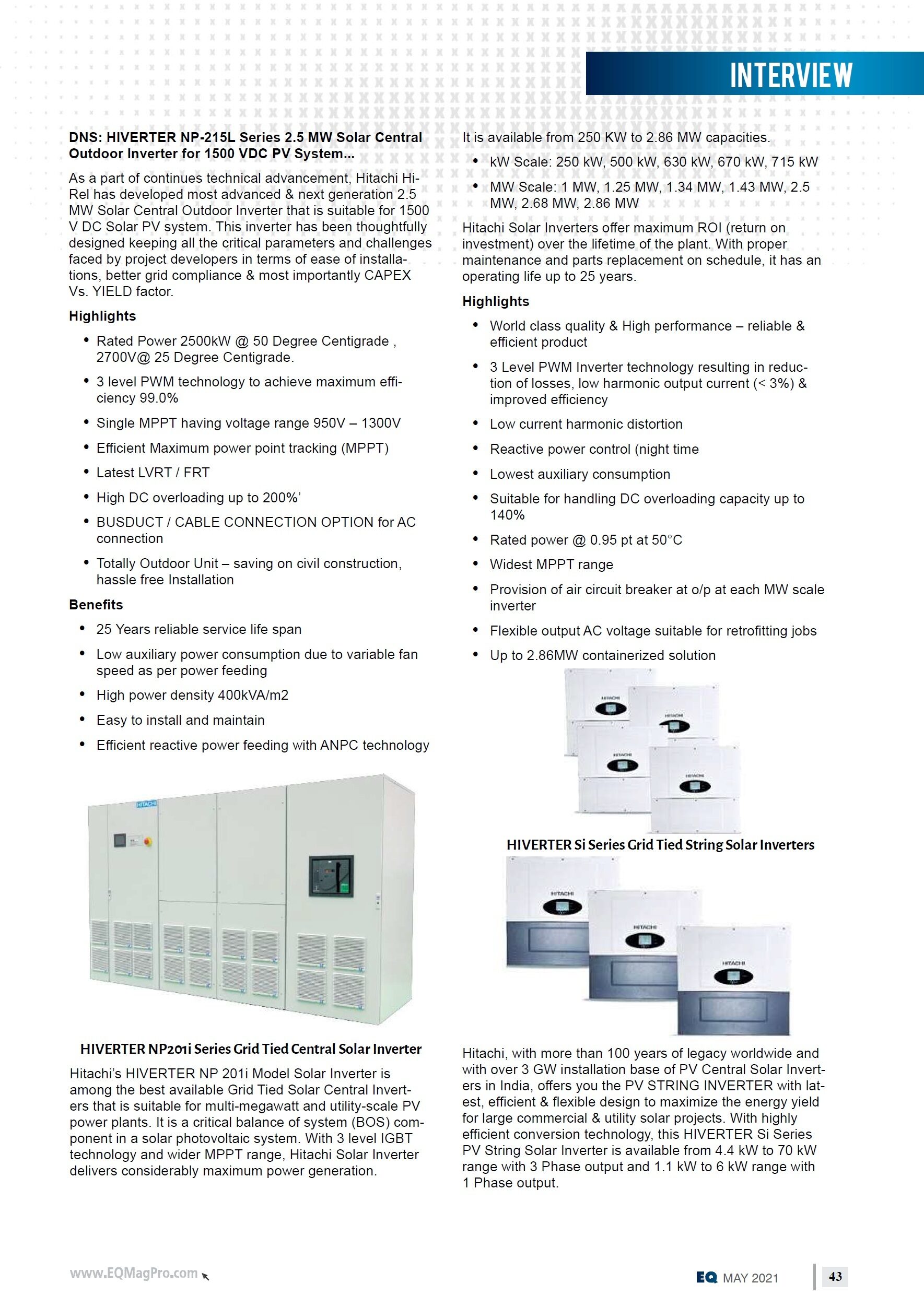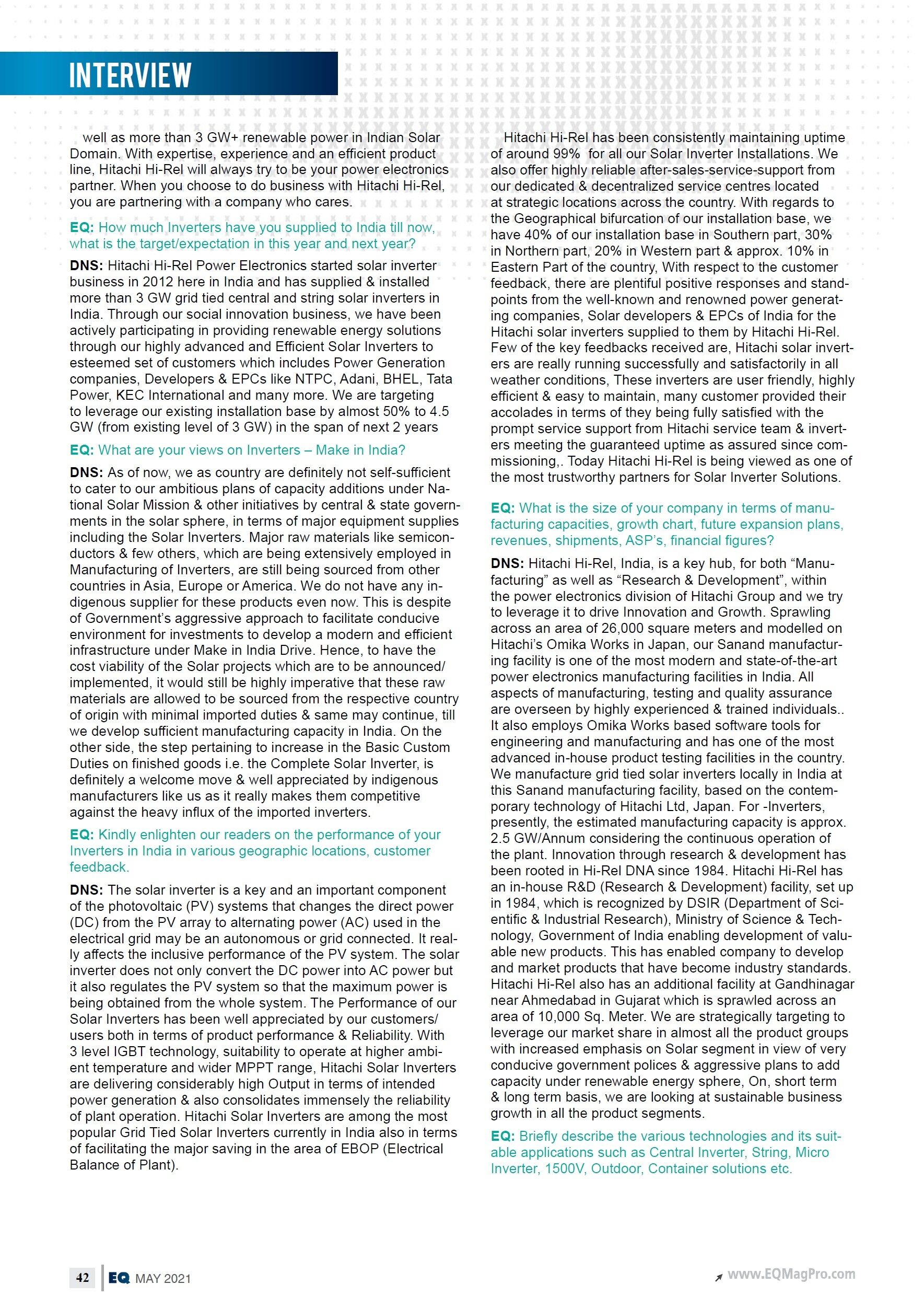 Hitachi's Presence in Indian Solar Domain - Coverage in Smart Energy Magazine (April 2019)