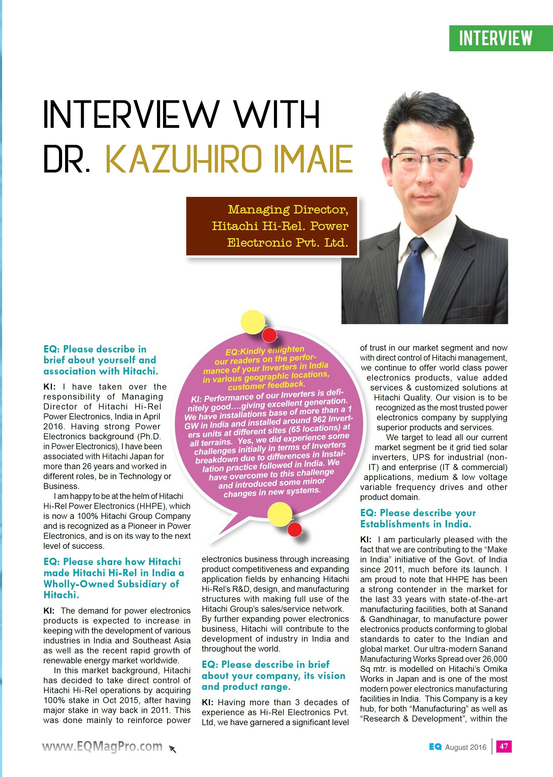 Interview of Dr. Kazuhiro Imaie (Managing Director) in EQ International August 2016 Issue