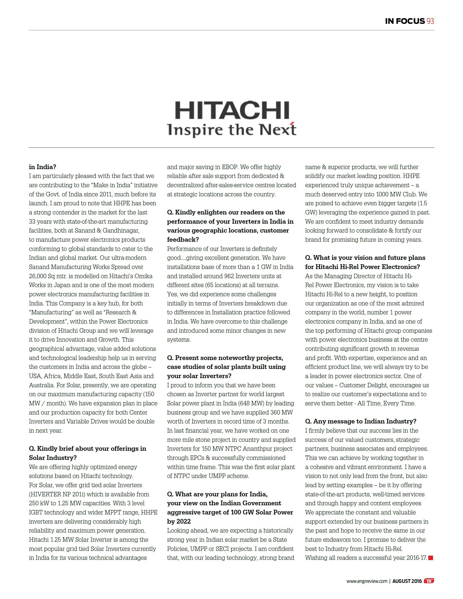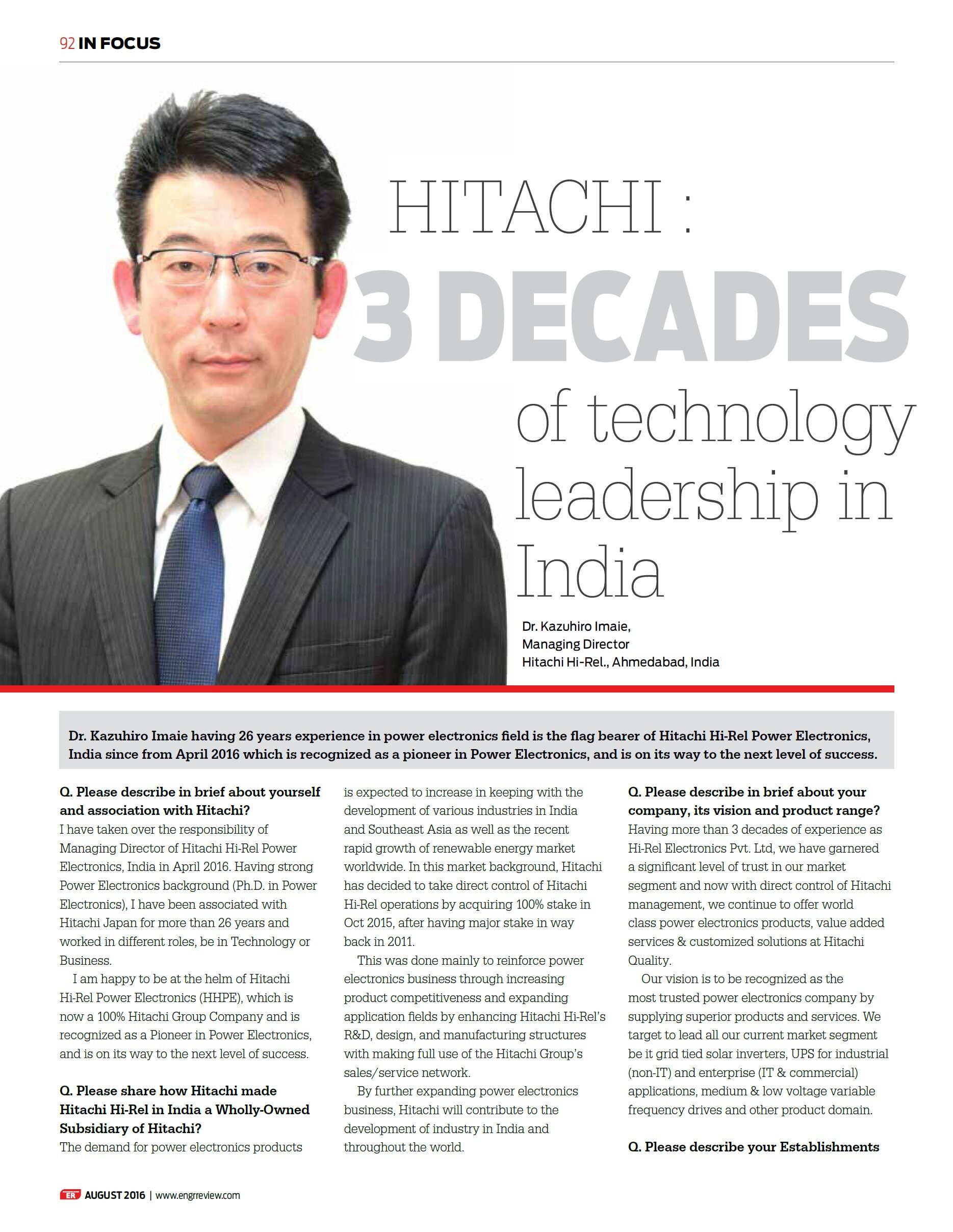 Interview of Dr. Kazuhiro Imaie (Managing Director) in Engg Review August 2016 Issue
