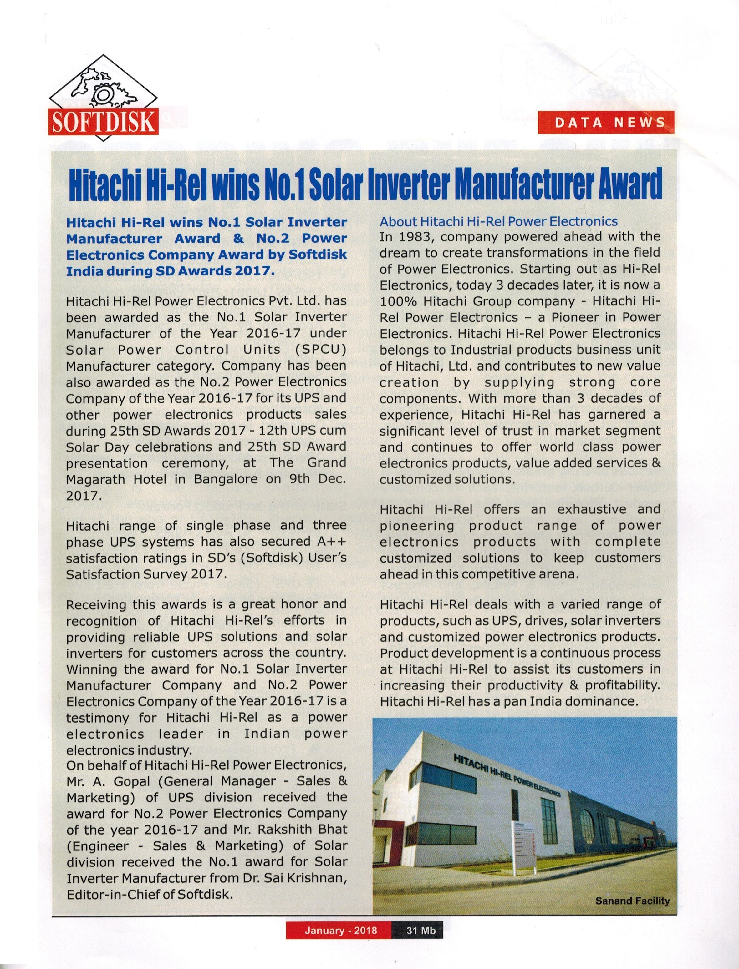 Hitachi Hi-Rel wins No.1 Solar Inverter Manufacturer Award
