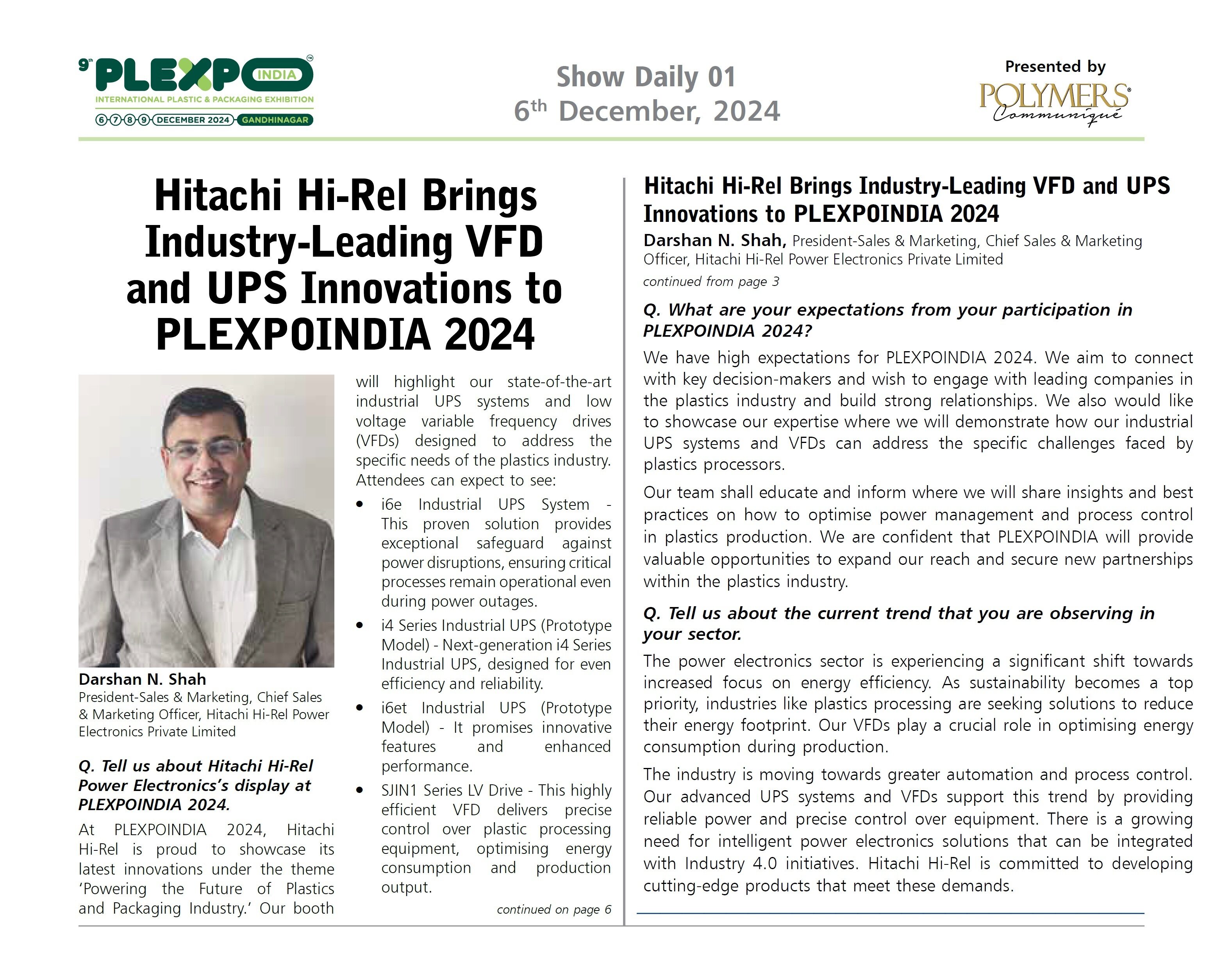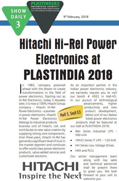 Media Coverage of Hitachi Hi-Rel at Plastindia 2018 Show Daily of Plastindia